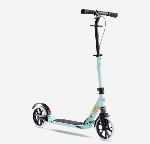 Detalles del productoPatinete Oxelo en color azul claro, diseñado para adultos. Es plegable y fácil de transportar.