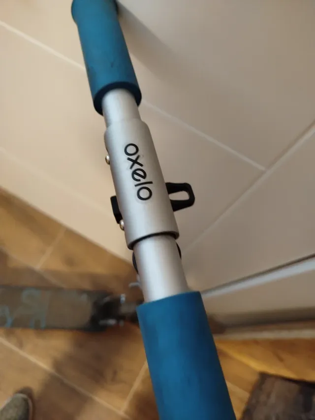 Patinete de la marca Oxelo con mangos de color azul. - Manillar ajustable en altura. - Plegable para facilitar su transporte. - Plataforma con diseño. - Ruedas de goma.