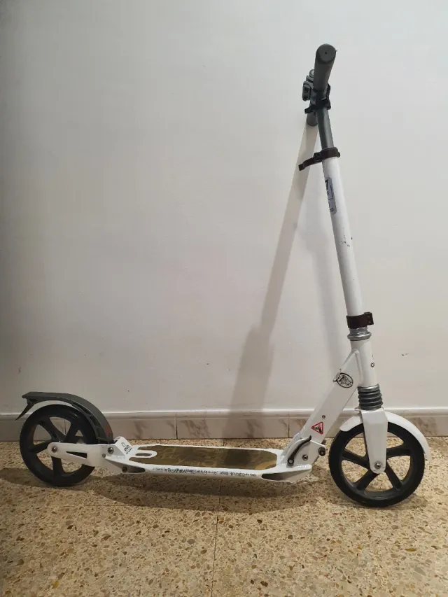 Patinete de la marca Oxelo en color blanco. - Ruedas de gran tamaño para un desplazamiento suave. - Manillar ajustable en altura. - Plataforma antideslizante.