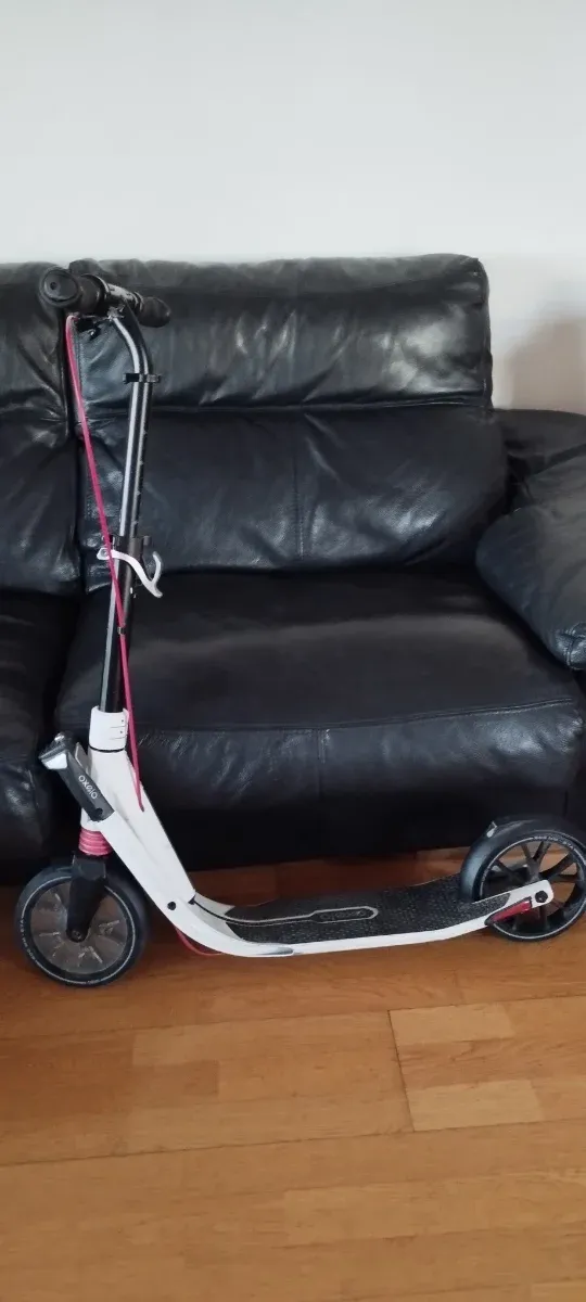 Patinete de la marca Oxelo en color blanco con detalles en rojo. Ideal para desplazamientos urbanos. - Plegable - Ruedas de goma. - Plataforma antideslizante.