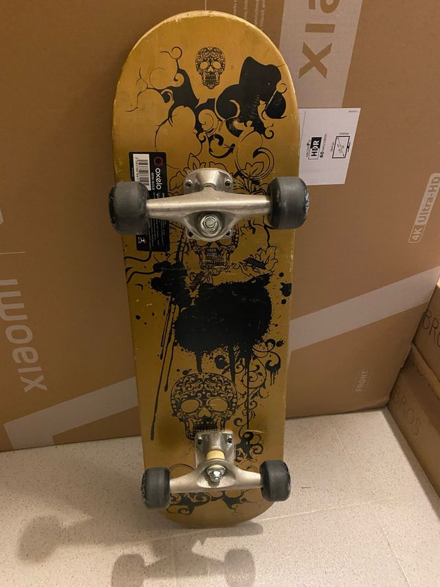 - Tabla con estampado de calaveras y motivos florales en negro sobre fondo dorado.
