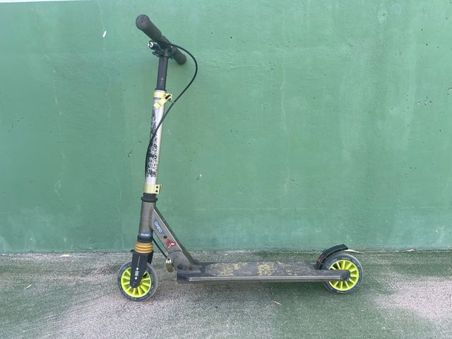 Patinete Oxelo com suspensión y freni delantero y trasero, ideal para niños. Está en buen estado, con algunas señales de uso.