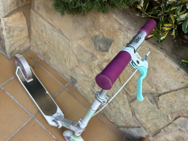 Detalles del productoPatinete de la marca Oxelo, disponible en Decathlon. Va perfectamente aunque el freno delantero está un poco suelto, el de detrás va perfecto. ideal para niños de 6 a 9 años. Plegable.