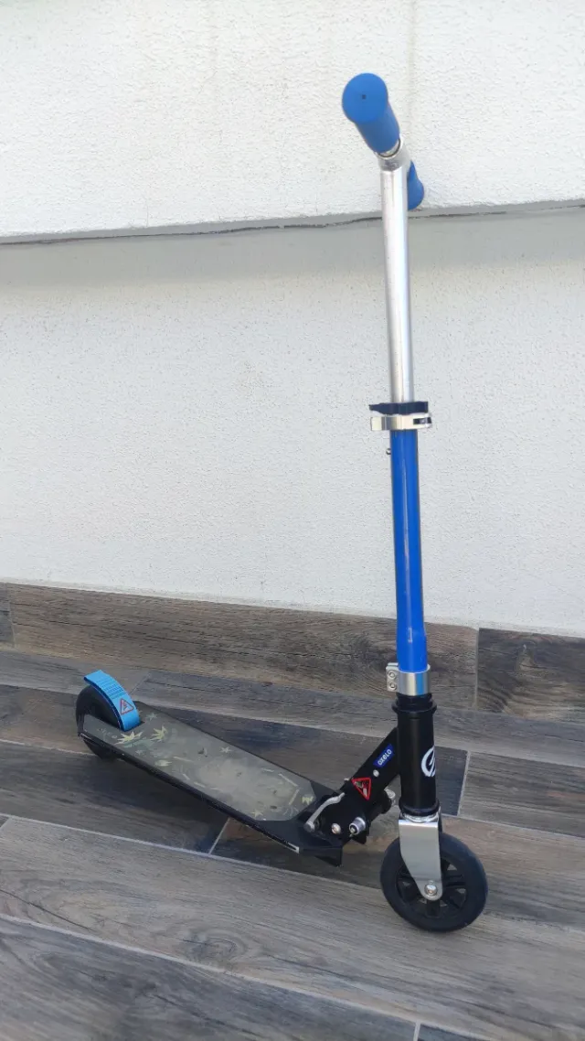 Patinete Oxelo de color azul. Ideal para niños de 6 a 9 años. Manillar ajustable en altura y plataforma antideslizante. Ver medidas en la última foto