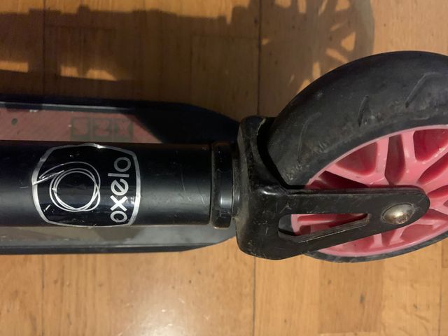 Patinete Oxelo Decathlon DTX en color negro y con detalles en rosa. - Ruedas de goma. - Marca Oxelo. - Freno trasero - Tres niveles de dificultad.
