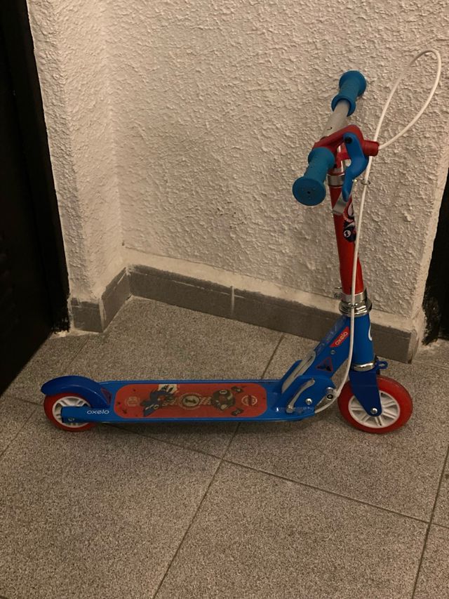 Patinete Oxelo diseñado para niños, con una combinación de colores llamativa. - Base azul con gráficos. - Manillar rojo y puños azules. - Ruedas rojas.