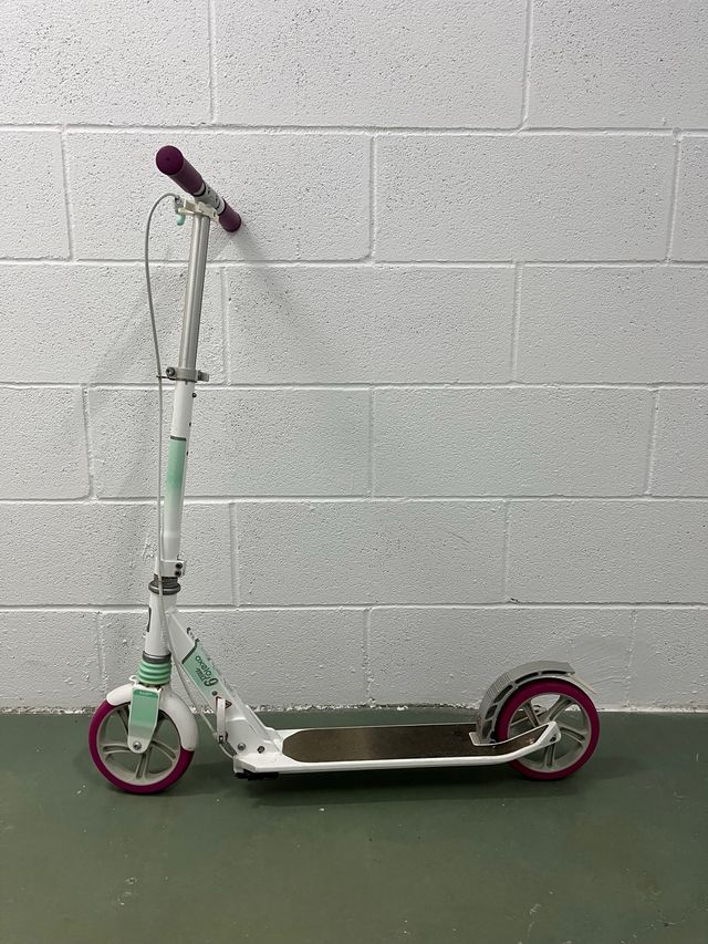 Patinete Oxelo MID 9 en color blanco y detalles en verde y morado.