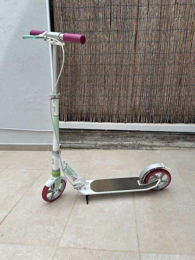 Patinete Oxelo MID 9 en color blanco, verde y morado. Es plegable y fácil de transportar. - Manillar ajustable. - Ruedas de 200 mm. - Freno trasero.