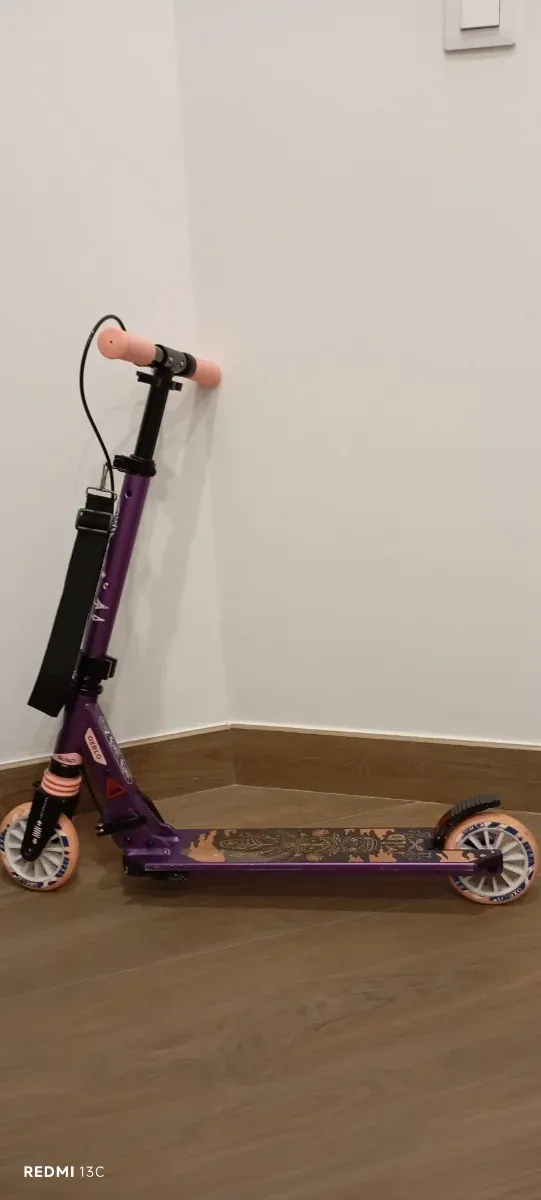 Patinete Oxelo MID5 en color morado. Ideal para desplazamientos urbanos. - Manillar ajustable en altura. - Ruedas de 200 mm. - Freno trasero. - Plataforma ancha.
