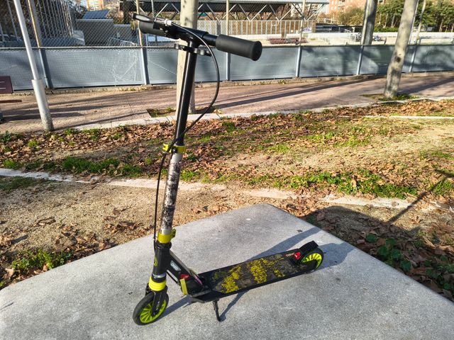 Detalles del productoPatinete Oxelo MID 5 en color azul, diseñado para niños (con unos 3 años de uso). Cuenta con un manillar ajustable en altura, freno en manillar tipo bicicleta y ruedas de goma para un mejor agarre.