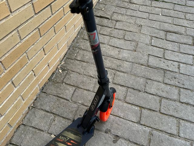 Patinete Oxelo MID7 de Decathlon. - Color negro y naranja. - Plataforma con diseño gráfico. - Ruedas de color naranja.