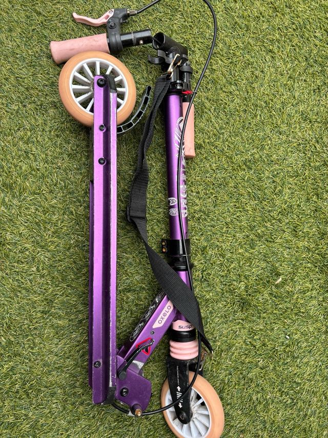 Detalles del productoPatinete Oxelo de Decathlon en color morado. Ideal para desplazamientos urbanos.