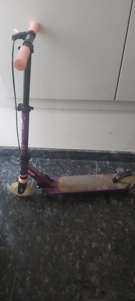 Patinete Oxelo de color morado, ideal para desplazamientos urbanos. - Manillar ajustable. - Ruedas resistentes. - Plataforma antideslizante. - Luz de colores en las ruedas.