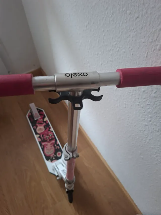 Detalles del productoPatinete infantil de la marca Oxelo, ideal para niñas. Presenta un diseño divertido y colorido en la base.