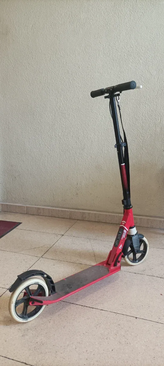 Patinete Oxelo en buen estado, ideal para desplazamientos urbanos. - Color rojo y negro. - Ruedas blancas. - Manillar ajustable.