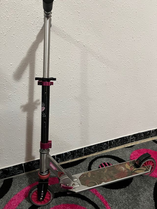 Detalles del productoPatinete de la marca Oxelo, con un diseño moderno en color rosa y plateado. Ideal para desplazamientos urbanos.