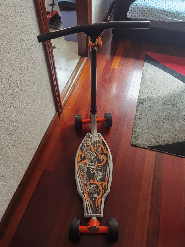 Patinete Oxelo Stun Street en buen estado. No tiene frenos. - Diseño llamativo con llamas naranjas. - Estructura resistente. - cuatro ruedas para mayor estabilidad.