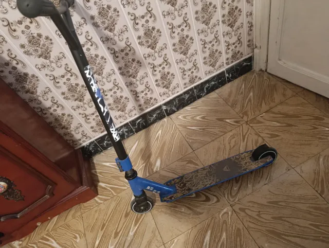 Patinete estilo Oxelo, ideal para desplazamientos urbanos y trucos. - Manillar negro con puños negros. - Base azul con diseño gráfico. - Ruedas negras.