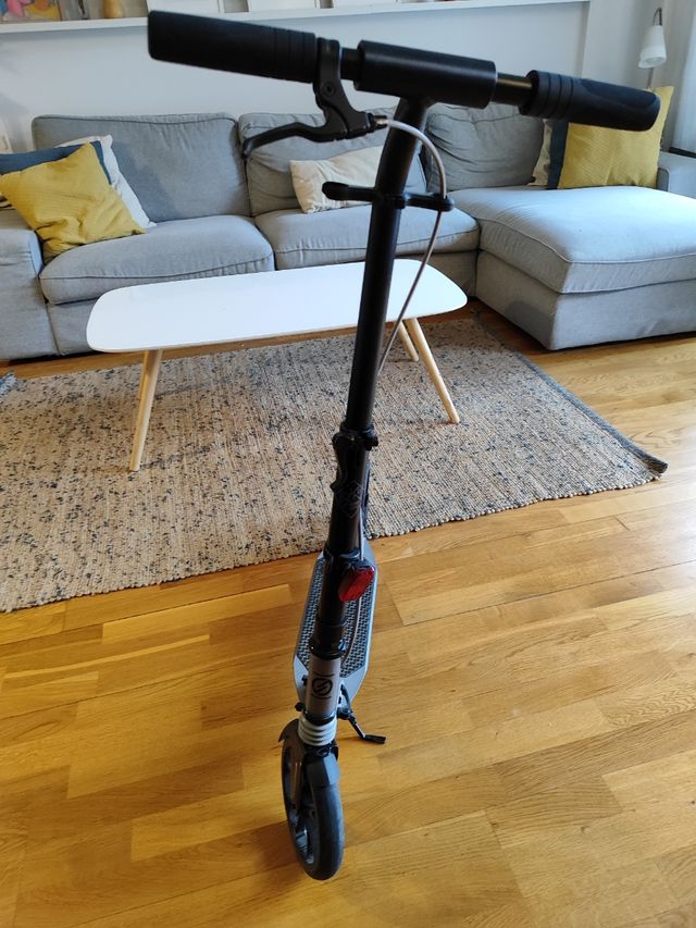 Cómodo gracias a su freno en el manillar y su doble suspensión. Desplázate más rápidamente y llega más lejos que a pie. La plataforma mide 34 cm le largo por 12 cm de ancho. Soporta máximo 100 kg.