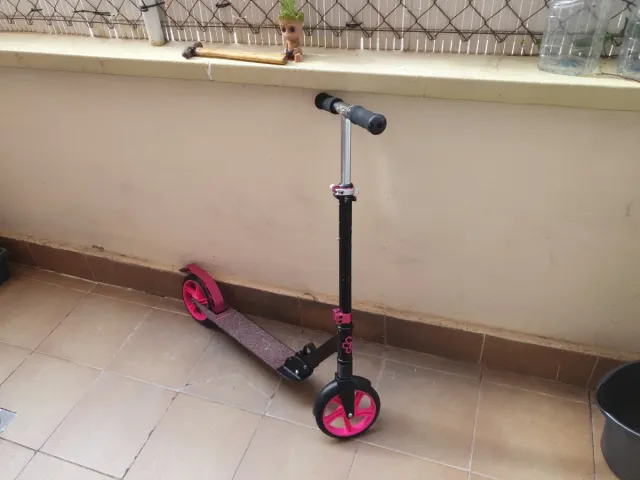 Patinete de pie con ruedas rosas y diseño divertido. - Manillar ajustable en altura. - Plataforma antideslizante. - Ruedas de goma para un mejor agarre.
