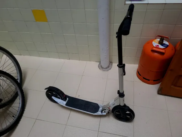 Patinete plegable de color gris, ideal para desplazamientos urbanos. - Diseño moderno y funcional. - Ruedas de goma para un mejor agarre. - Manillar ajustable en altura.