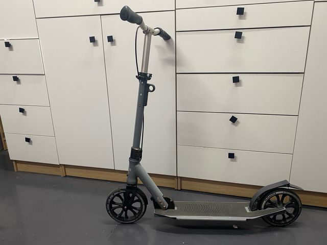 Patinete plegable de color gris, ideal para desplazamientos urbanos. - Manillar ajustable en altura. - Ruedas de goma. - Plataforma antideslizante.