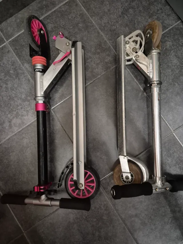 Detalles del productoSe venden dos patinetes infantiles plegables, uno de color rosa y negro y otro plateado.