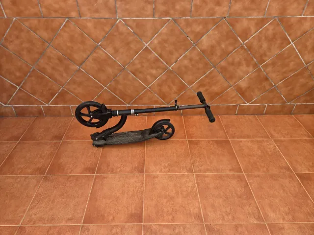 Patinete plegable de color negro, ideal para desplazamientos urbanos. - Manillar ajustable en altura. - Ruedas de goma. - Plataforma antideslizante.