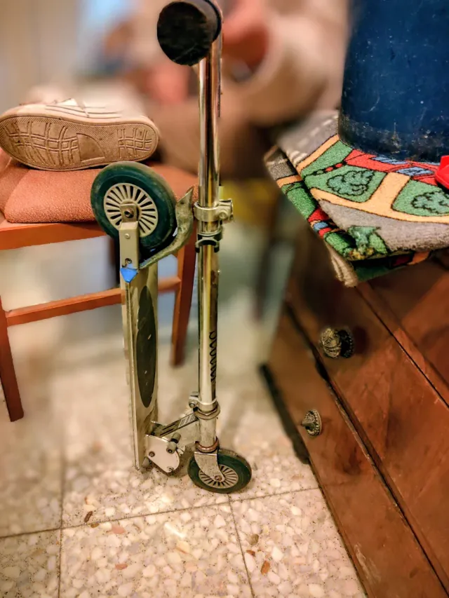 Patinete plateado con diseño plegable. Ideal para desplazamientos urbanos. - Estructura de metal. - Ruedas de goma. - Empuñaduras negras.