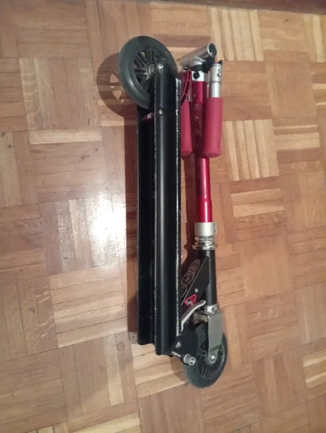Patinete plegable con un diseño moderno en rojo y negro. - Manillar ajustable en altura. - Ruedas de goma para un mejor agarre. - Plataforma antideslizante.