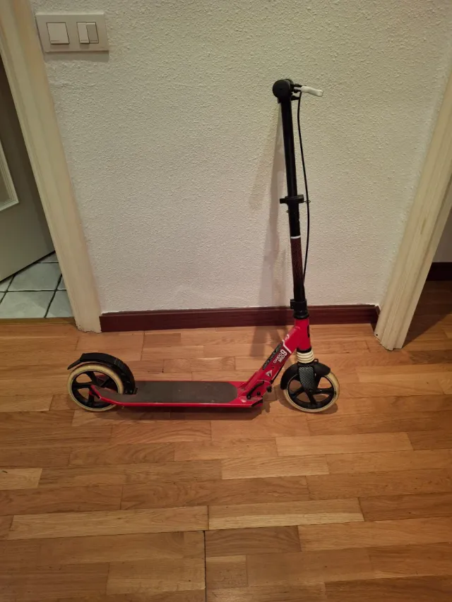 Patinete de color rojo, ideal para desplazamientos urbanos. - Ruedas de goma. - Manillar ajustable en altura. - Plataforma antideslizante.