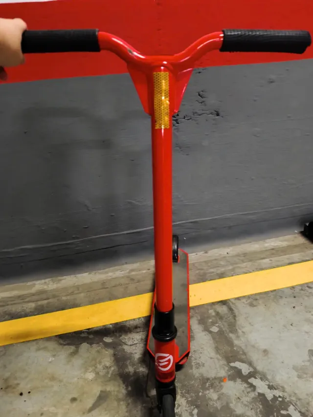 Patinete de color rojo con detalles reflectantes. - Manillar con puños negros. - Plataforma gris. - Ruedas negras.