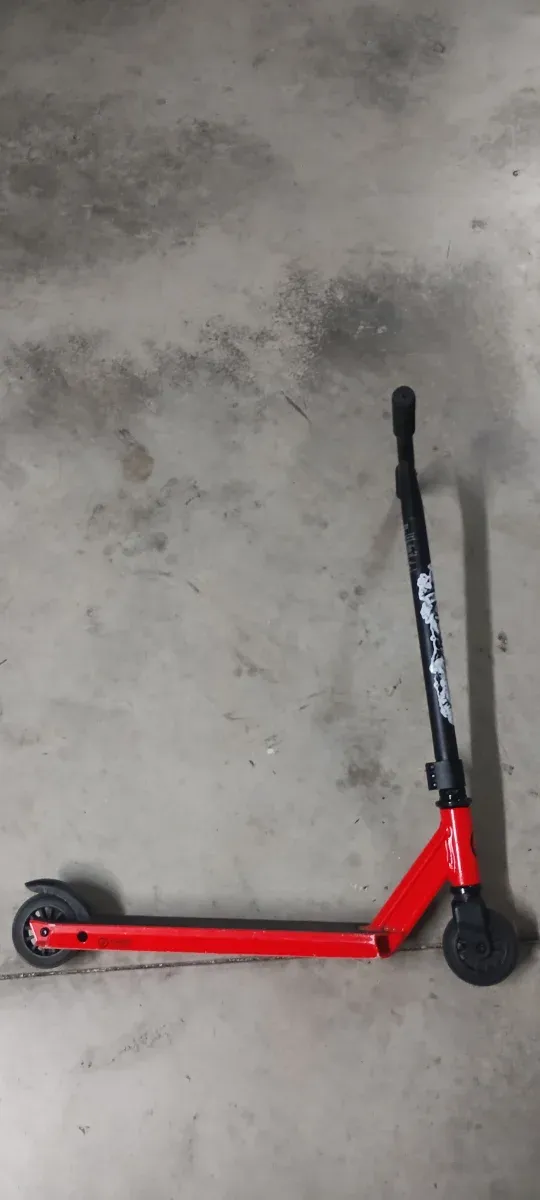 Patinete de estilo urbano con un diseño llamativo. - Base y manillar en color negro. - Chasis principal en color rojo vibrante. - Ruedas de goma negra.
