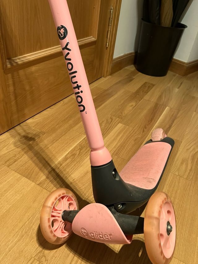 Detalles del productoPatinete infantil de tres ruedas en color rosa, marca Yvolution modelo Glider.