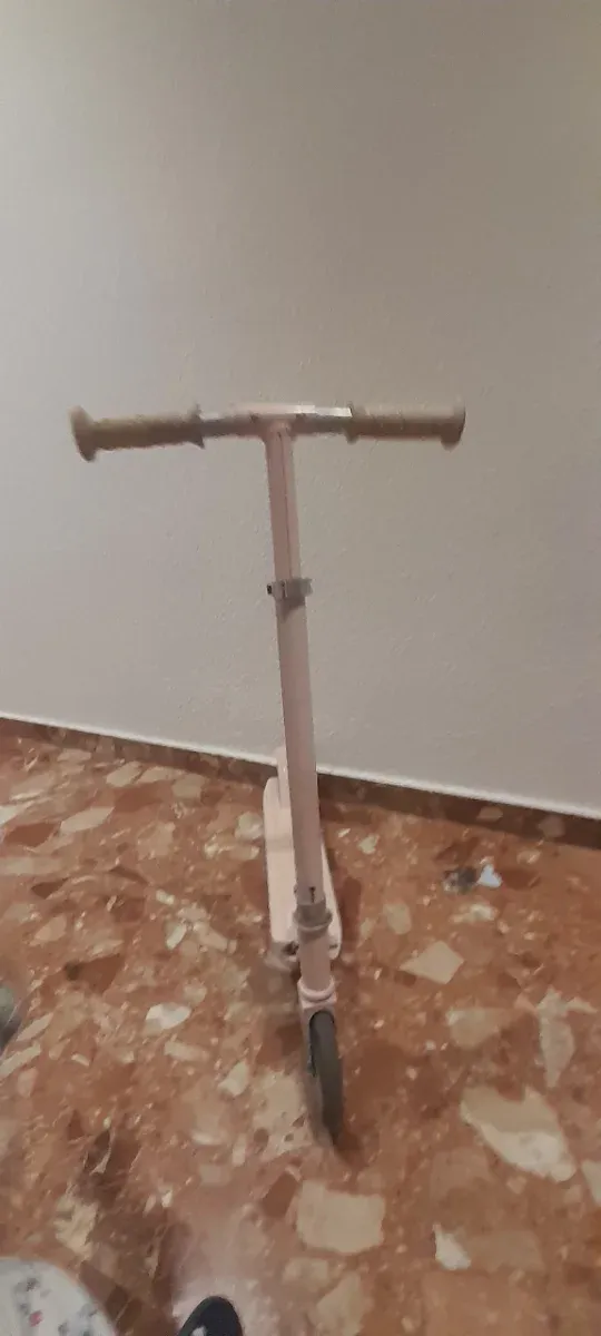 Patinete de color rosa claro. - Manillar con empuñaduras. - Ruedas para desplazarse.