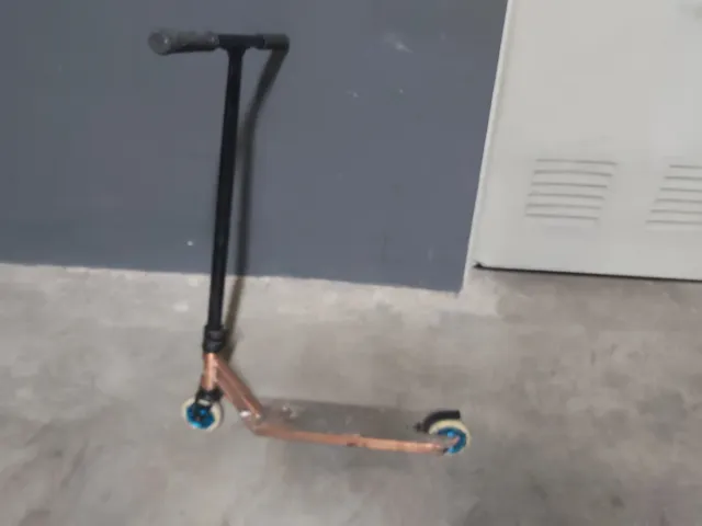 Patinete tipo scooter. - Manillar negro. - Base y ruedas de color cobre. - Ruedas con detalles azules.