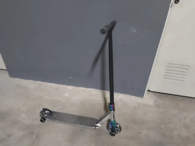 Patinete de estilo freestyle, ideal para trucos y acrobacias. - Plataforma metálica. - Manillar negro. - Ruedas con detalles de colores.