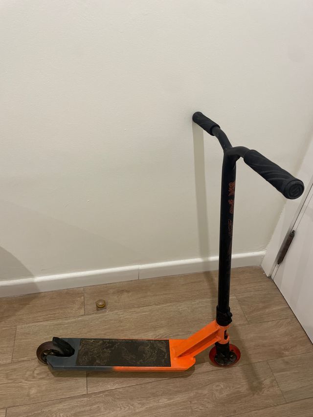 Patinete tipo scooter con manillar negro y base naranja. - Ruedas de color rojo. - Puños negros para un mejor agarre. - Base con diseño gráfico.