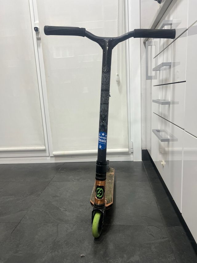 Patinete scooter con manillar negro y base de cobre. - Manillar negro. - Base de color cobre. - Rueda delantera verde.