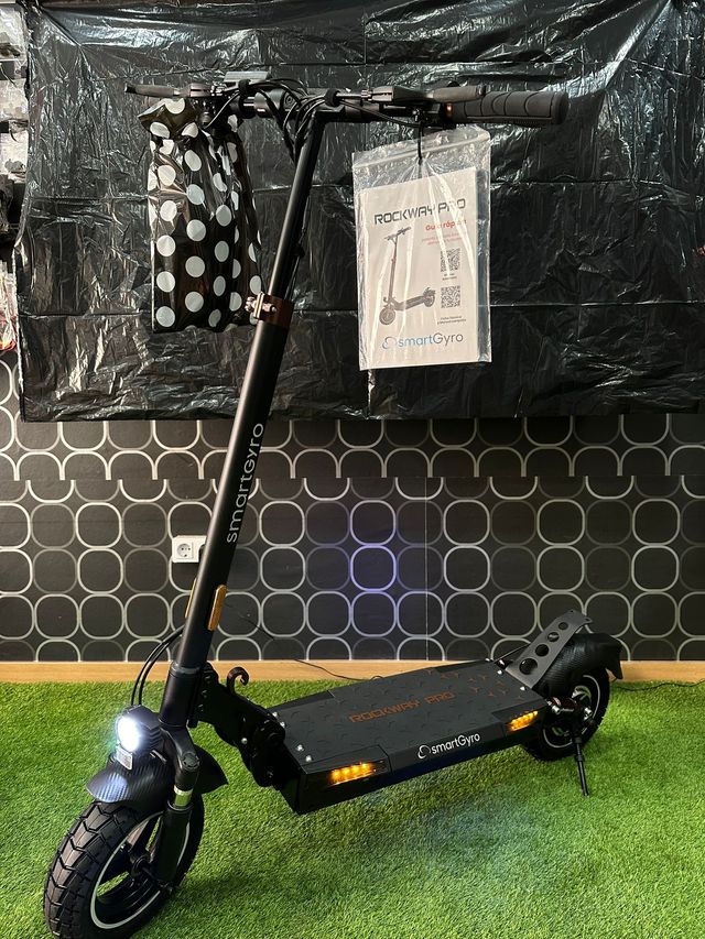 Detalles del productoPatinete eléctrico certificado con una potencia máxima de 1000W 48V, batería de litio de 15.000 mAh con hasta 60 km de autonomía, ruedas de 10" neumáticas, suspensión delantera y trasera, triple frenada e intermitentes: smartGyro Rockway Pro.