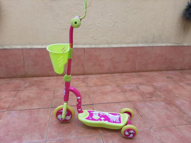 Detalles del productoPatinete de tres ruedas, con cestita. Regulable en altura. Edad de dos a seis años, adecuado para pequeños al ser de plástico y no tener esquinas metálicas. En buen estado.