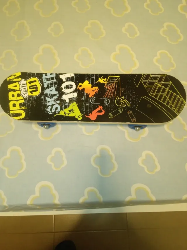 Detalles del productoPatinete con diseño Urban Skate 101 y gráficos de skaters.
