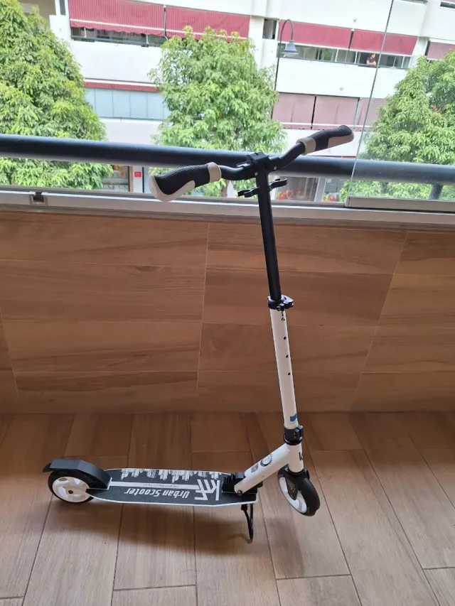 Detalles del productoPatinete urbano de color blanco con detalles en negro y gris.