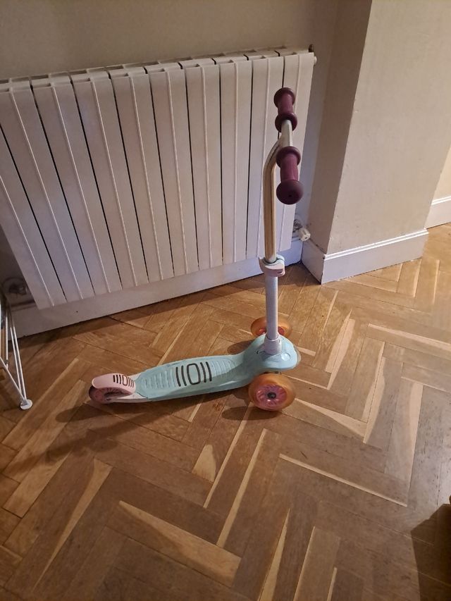Detalles del productoPatinete infantil de tres ruedas en color azul claro y rosa.