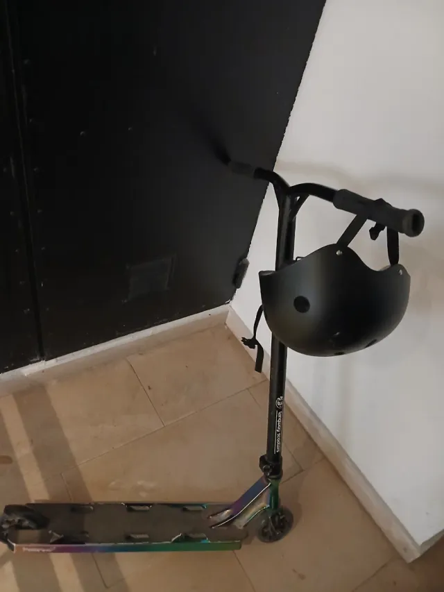Se vende patinete con casco. - Patinete con diseño iridiscente. - Casco protector negro.