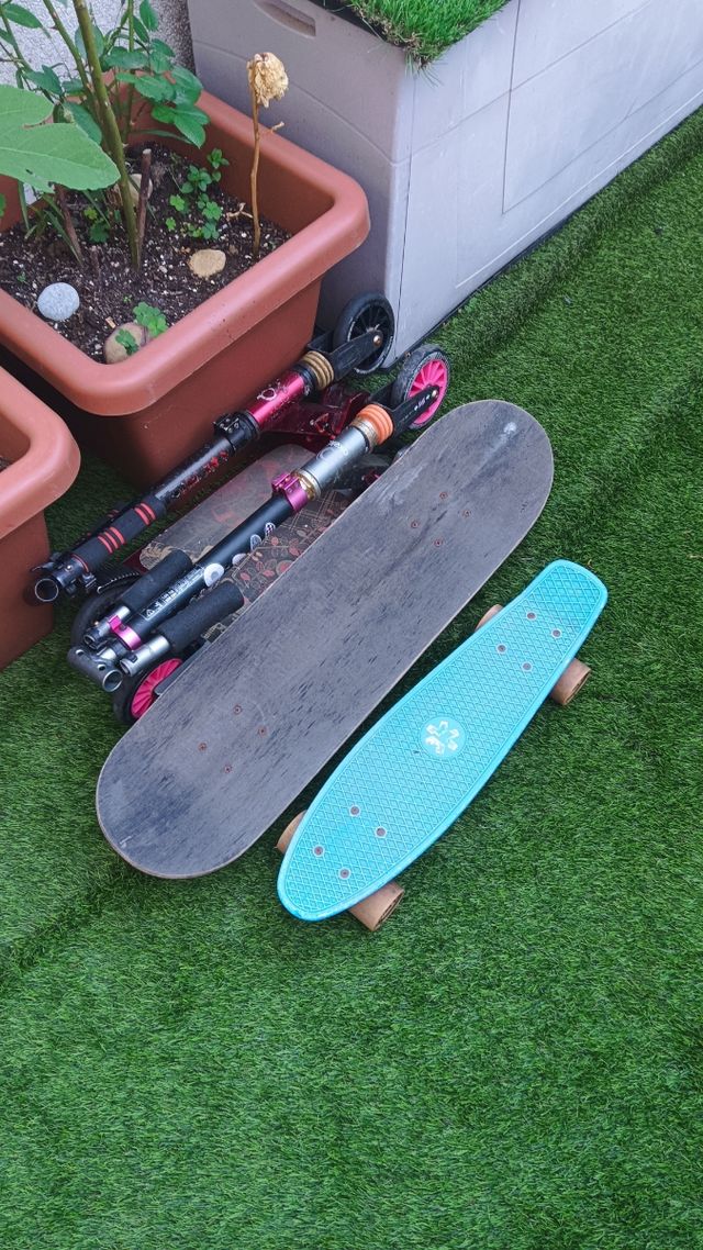 Lote de patinete y monopatín. - Patinete con ruedas rosas. - Monopatín de madera.