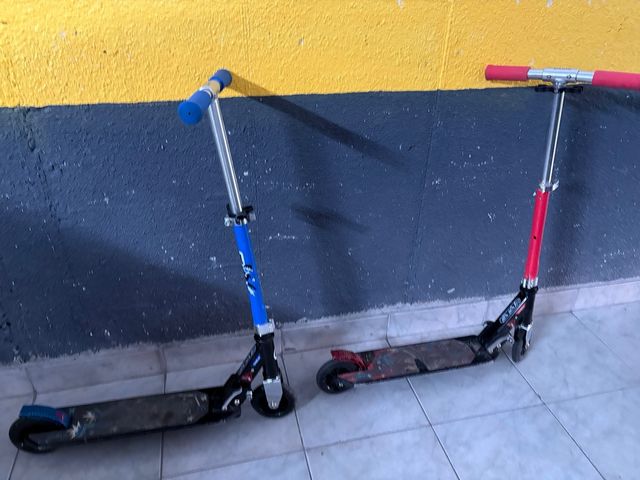 Detalles del productoDos patinetes infantiles, uno azul y otro rojo, listos para la diversión.