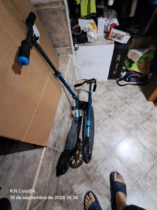 Detalles del productoDos patinetes infantiles de color azul y negro, perfectos para que los niños disfruten al aire libre. Son desmontables para facilitar su transporte y almacenamiento.