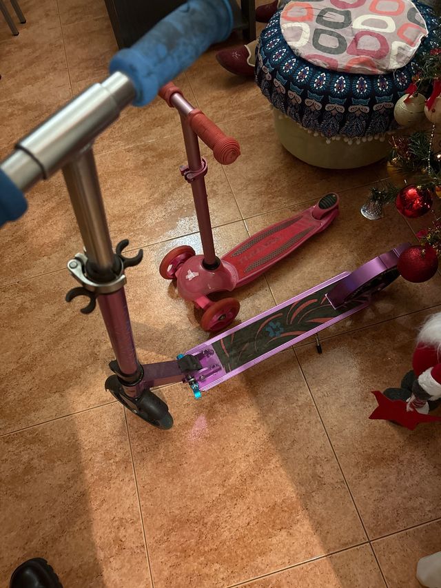 Detalles del productoDos patinetes infantiles, uno rosa y otro morado, perfectos para que los niños disfruten al aire libre.