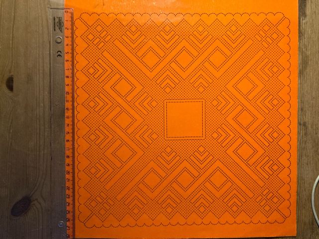 Preciosa plantilla para realizar un pañuelo con la técnica de bolillos. Es de color naranja y presenta un diseño geométrico. - Medidas en las fotos